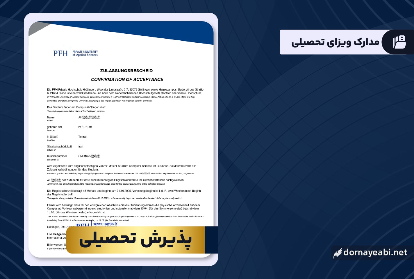 با هدایت تیم درنای آبی، آقای مهرابی موفق به دریافت نامه پذیرش از یکی از دانشگاههای معتبر آلمان در رشته Computer Science for Business شدند. این پذیرش که به صورت تمام وقت و به زبان انگلیسی است، برای شروع تحصیل از تاریخ ۹ مهر ۱۴۰۴ صادر شده بود. با کمک درنای آبی، پرونده ویزا بدون کوچکترین مشکل پیش رفت و آقای علی در تاریخ ۱۸ تیر ۱۴۰۴ موفق به اخذ ویزای تحصیلی خود گردیدند.